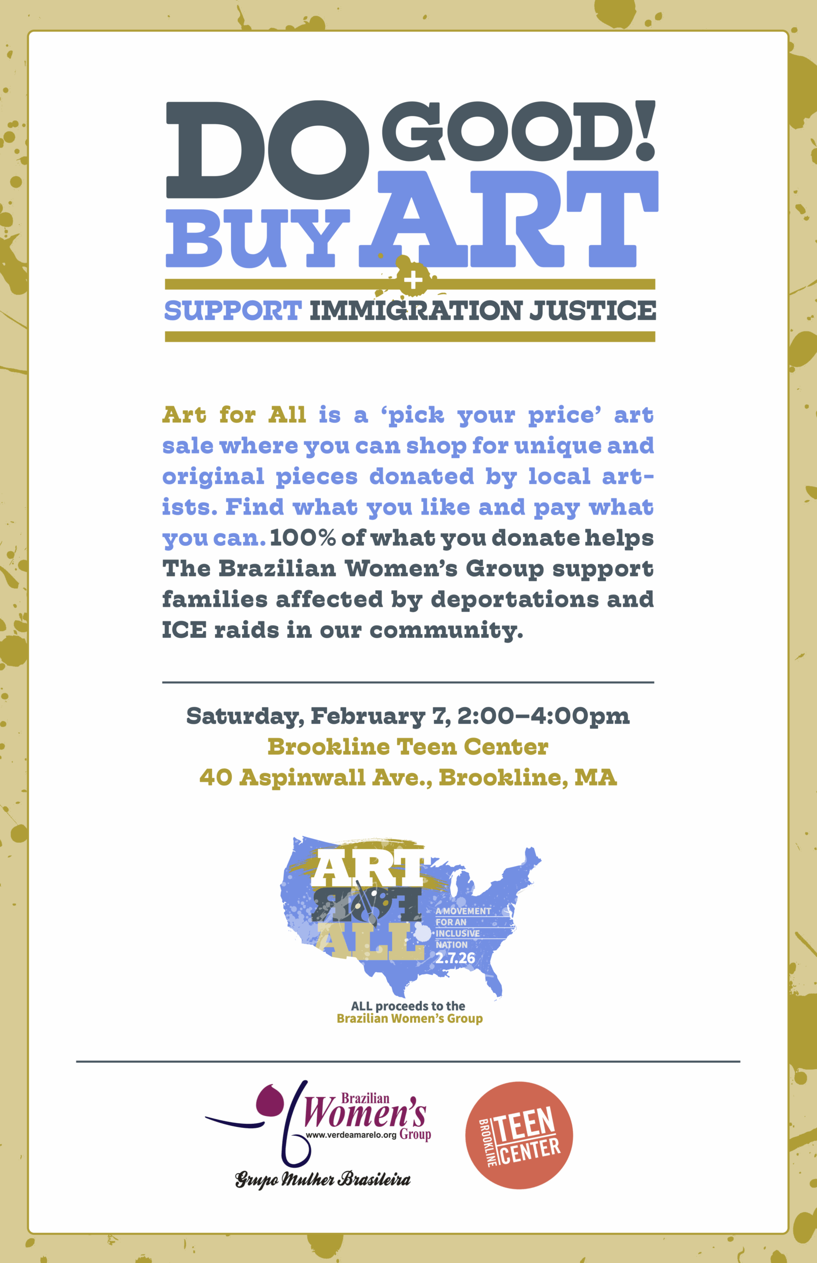 Art for All is a ‘pick your price’ art sale where you shop for unique and original pieces donated by local artists. Find what you like and pay what you can. 100% of what you donate helps The Brazilian Women’s Group support families affected by deportations and ICE raids in our community.